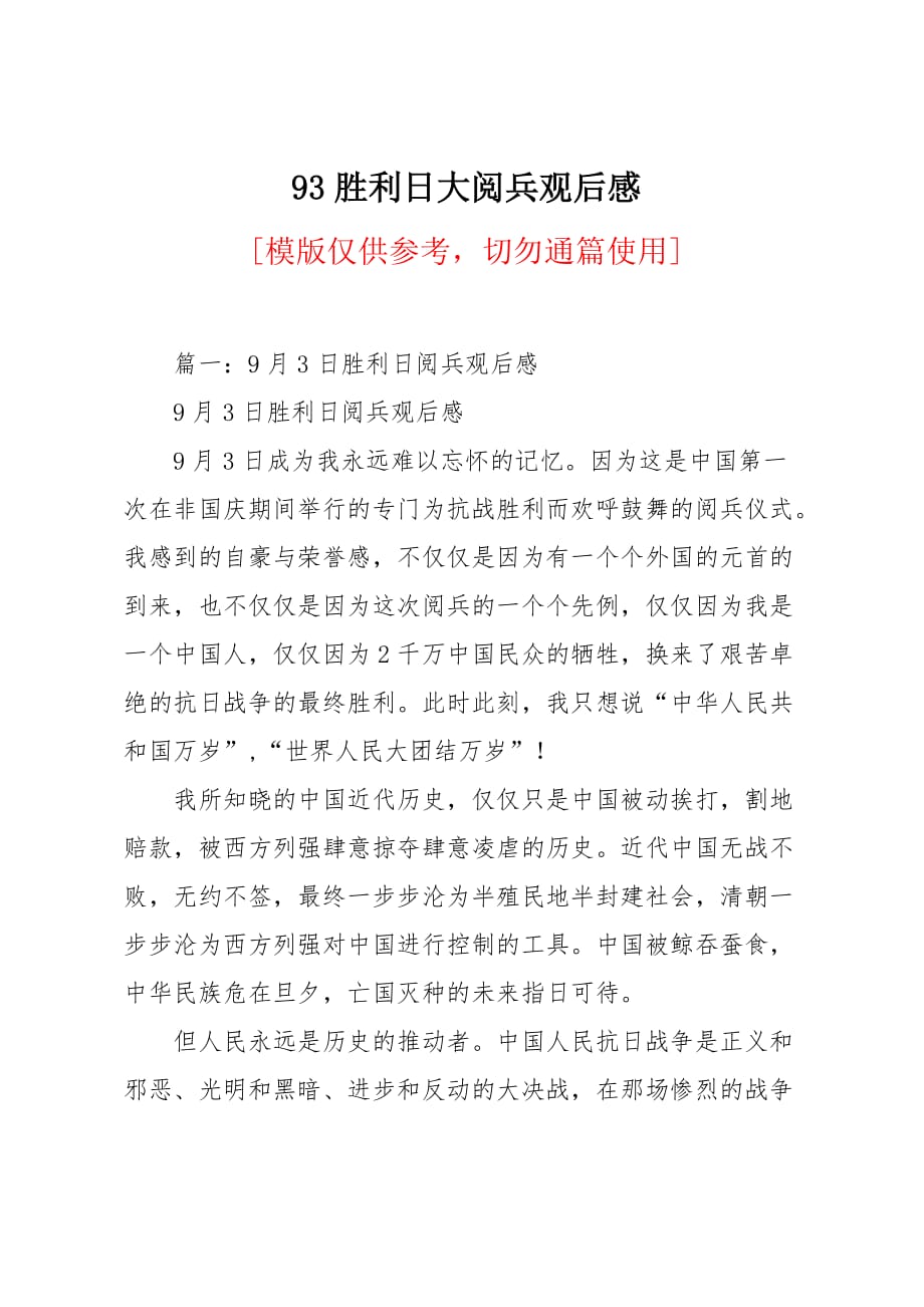 胜利日大阅兵观后感:荣耀与力量的展现。阅兵式中,我国展示了强大的军事力量,各种先进武器装备亮相,彰显国家实力。整齐划一的方阵,彰显着军人的荣耀和国家的团结。阅兵式不仅是一次军事展示,更是对和平的宣誓,传递出维护世界和平的坚定决心。观后感慨万分,为祖国的强大感到自豪,同时也深知背后无数英雄的努力与牺牲。这是一场振奋人心的阅兵,让人倍感振奋与鼓舞。