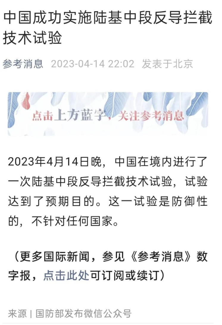 据报道,中国最近的反导试验取得了圆满成功,这标志着中国在导弹技术领域的又一重要突破,反导技术是一个国家国防实力的重要组成部分,其成功与否直接关系到国家的安全与发展,此次反导试验的成功,充分展示了中国在导弹技术领域的实力,也证明了中国在维护国家安全方面的能力。